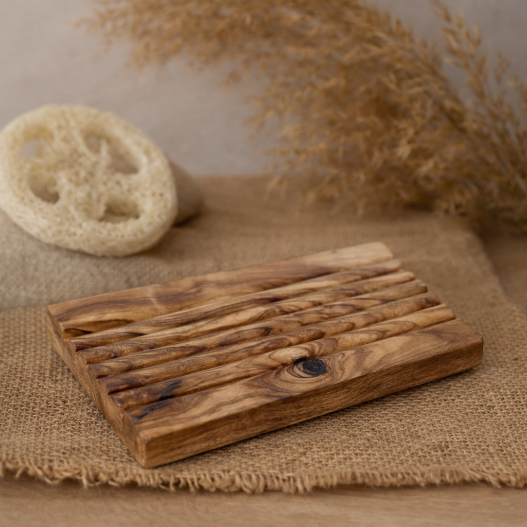 Diese Seifenablage aus edlem Olivenholz bringt warme Natürlichkeit in dein Badezimmer und sorgt dafür, dass deine Naturseife optimal trocknen kann.